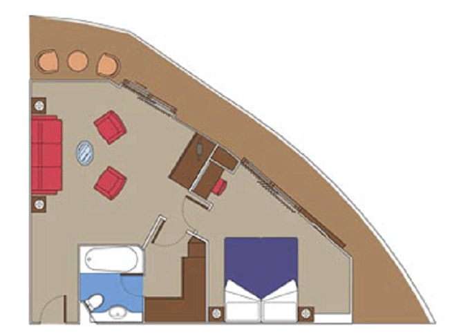 Suite s balkónom/panoramatickým oknom: cca32m²(Royal suite: 52m², Family suite: 45-53m², Deluxe Suite: 32-39m², Aurea suite: 21-47m²), kajuta s manželskou posteľou (na požiadanie 2 oddelené postele) a rozkladacia pohovka. Klimatizácia, kúpeľňa s vaňou, toaletný stolík, priestorná skriňa, interaktívna TV, telefón, minibar, sejf, sušič na vlasy. Balkón so stolíkom a stoličkami/panoramatickým oknom. Internetové pripojenie (za poplatok).