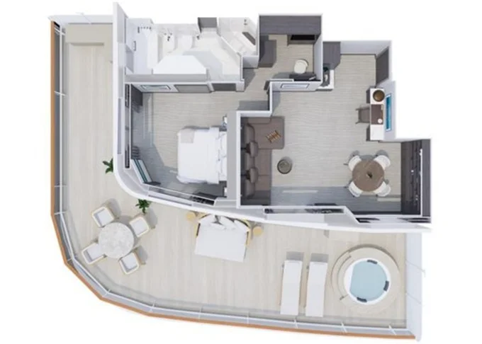 Retreat Residence Suita 63 m² + Terasa s vírivkou a sedením 14 m² / 7. paluba: 18 m². Spálňa s obývacou a jedálenskou časťou, šatník. Koktailová súprava, minibar, kávovar, vodná kanvica, ďalekohľad, sejf, mramorová kúpeľňa s vaňou a sprchou, extra wc. Taška Technogym Case Kit. Fľaša šampanského na privítanie. Služby osobného majordóma. Maximálna kapacita 3 dospelí alebo 2 dospelí + 2 deti pod 18 rokov. 114 460 € 28 615 € za osobu